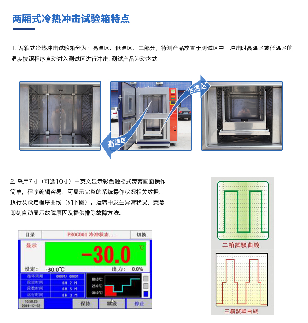 用途:兩廂式冷熱沖擊試驗箱又名溫度沖擊試驗箱或高低溫沖擊試驗箱是用于考核產品對周圍環境溫度急劇變化的適應性,裝備設計定型的鑒定試驗和批產階段的例行試驗中不可缺少的試驗